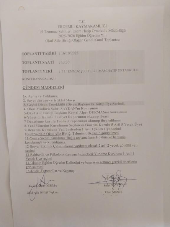 Okulumuz Aile Birliği'nin 2025/2026 Eğitim öğretim Yılı Olağan Genel Kurulu Toplantısı 16 Ekim 2025 Perşembe günü saat: 13.30'da okulumuz konferans salonunda aşağıdaki gündem maddeleri ile toplantı yapılacaktır.